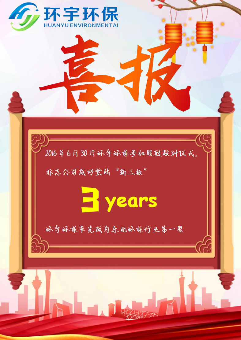 2016年6月30日环宇环保参加股转敲钟仪式,标志公司成功登陆“新三板”3年,环宇环保率先成为东北环保行业第一股